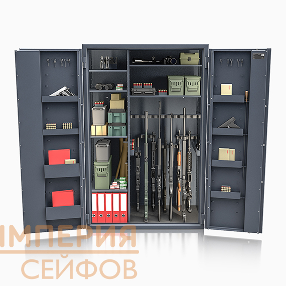 - Имеет шесть полок, что позволяет использовать семь зон хранения в сейфе для охотничьей амуниции и для хранения документации формата А4.