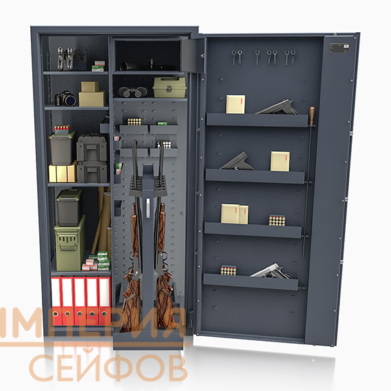 - Имеет пять полок, что позволяет использовать шесть зон хранения в сейфе для охотничьей амуниции и для хранения документации формата А4.