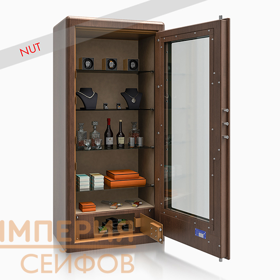 - Сейф имеет четыре стеклянные полки и внутренний сейф (опционально).