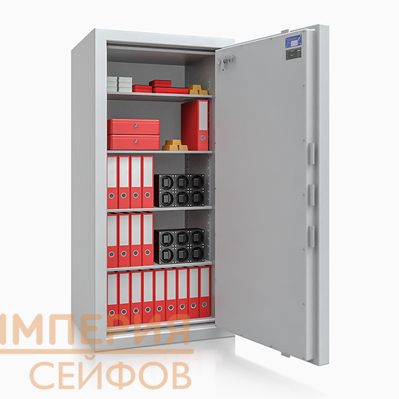 - Сейф містить 42 папки. Є 4 регульовані по висоті полиці та 5 гачків для ключів на внутрішній стороні дверей.